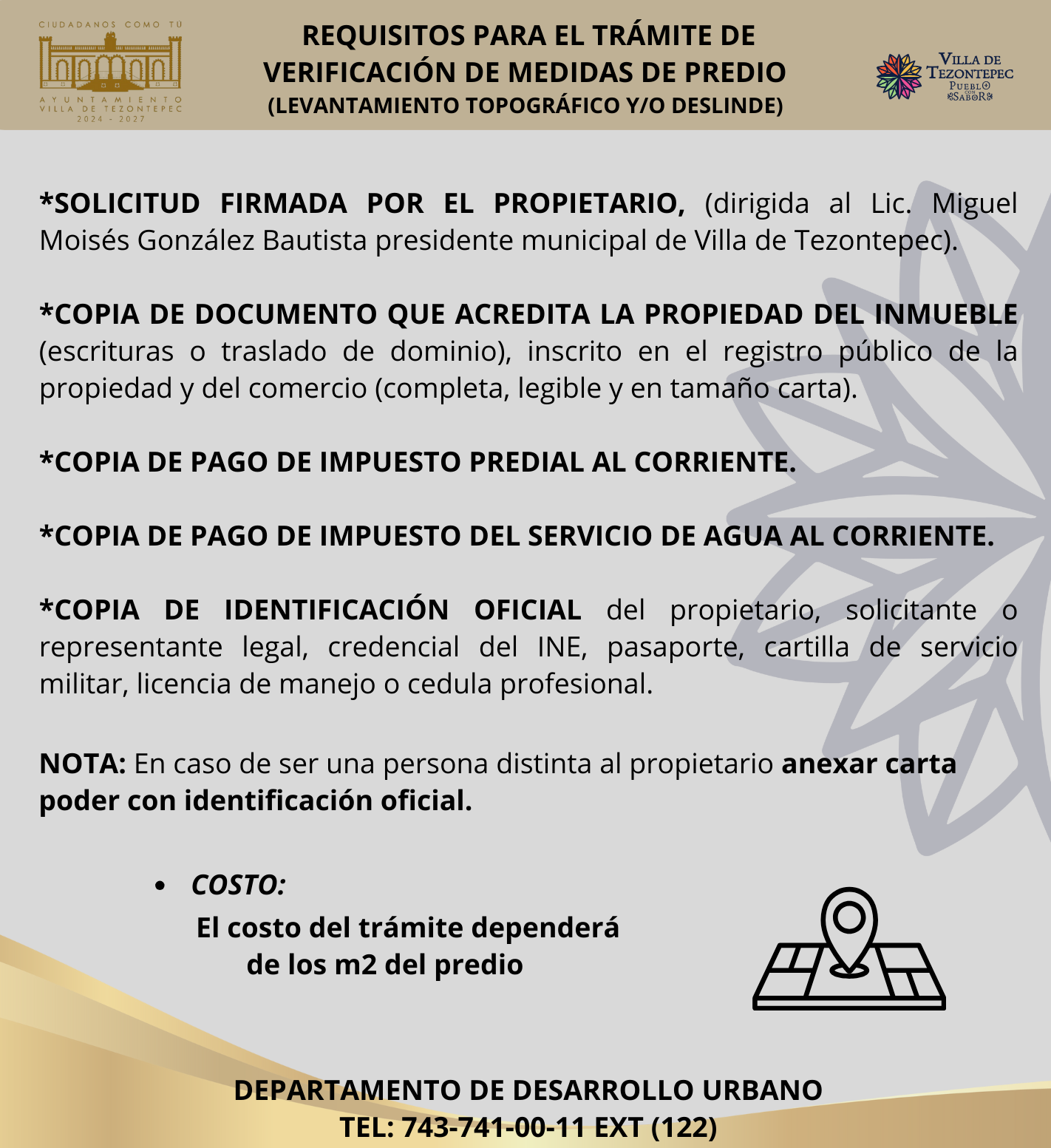 REQUISITOS PARA EL TRÁMITE DE VERIFICACIÓN DE MEDIDAS DE PREDIO (LEVANTAMIENTO TOPOGRAFICO Y/O DESLINDE)